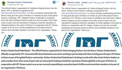 “The official Parkour organization for [country] bringing Parkour into the future. [name] is officially recognized by IPF- InternationalParkourFederation.com and is working in partnership with them to help grow the sport of Parkour in [country] as part of the global Parkour community. [name] is looking to work with other [country] Parkour leaders as well as leaders from other areas of sport who are interested in helping to build the reputation of [country] globally in the sport of Parkour in cooperation with IPF. Please contact us as we are currently assembling an executive board of officers and committee members to be part of our organization. Thank you.” ↩︎