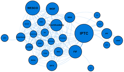 - Le réseau a également l’avantage de construire la légitimité de différentes organisations sportives. Plusieurs d’entre elles gravitent en effet non loin du système olympique, que ce soit le parkour, la danse sportive[9] ou le dodgeball, actuellement membre observateur de GAISF. La multiplication des références circulaires entre elles crée une belle façade de partenariats, qui donne du poids et un vernis officiel à ces organisations.