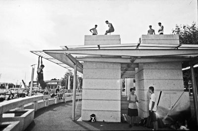 Finalement, la recherche d’accès à des espaces non utilisés est également une façon de réinvestir l’espace différemment. En accédant et en bougeant dans ces espaces, ils deviennent habités et une valeur émotionnelle est créée. Un exemple de cela est la pratique sur les toits. Sur le toit du parking d’Ouchy à Lausanne (figure 3), on peut voir un groupe de traceurs entrainer des sauts de précision. L’accès à cet espace se fait grâce au muret de gauche et à la barre sur le toit. Ce genre de développement des espaces inhabités est particulièrement étonnante pour les passants car il sort complètement des schémas habituels de perception et d’utilisation de la ville.